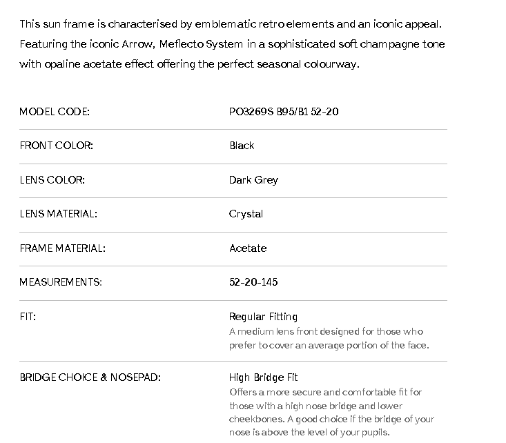 PO3269SThis sun frame is characterised by emblematic retro elements and an iconic appeal. Featuring the iconic Arrow, Meflecto System in a sophisticated soft champagne tone with opaline acetate effect offering the perfect seasonal colourway.