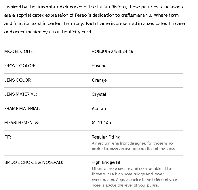 Inspired by the understated elegance of the Italian Riviera, these panthos sunglasses are a sophisticated expression of Persol's dedication to craftsmanship. Where form and function exist in perfect harmony. Each frame is presented in a dedicated tin case and accompanied by an authenticity card.