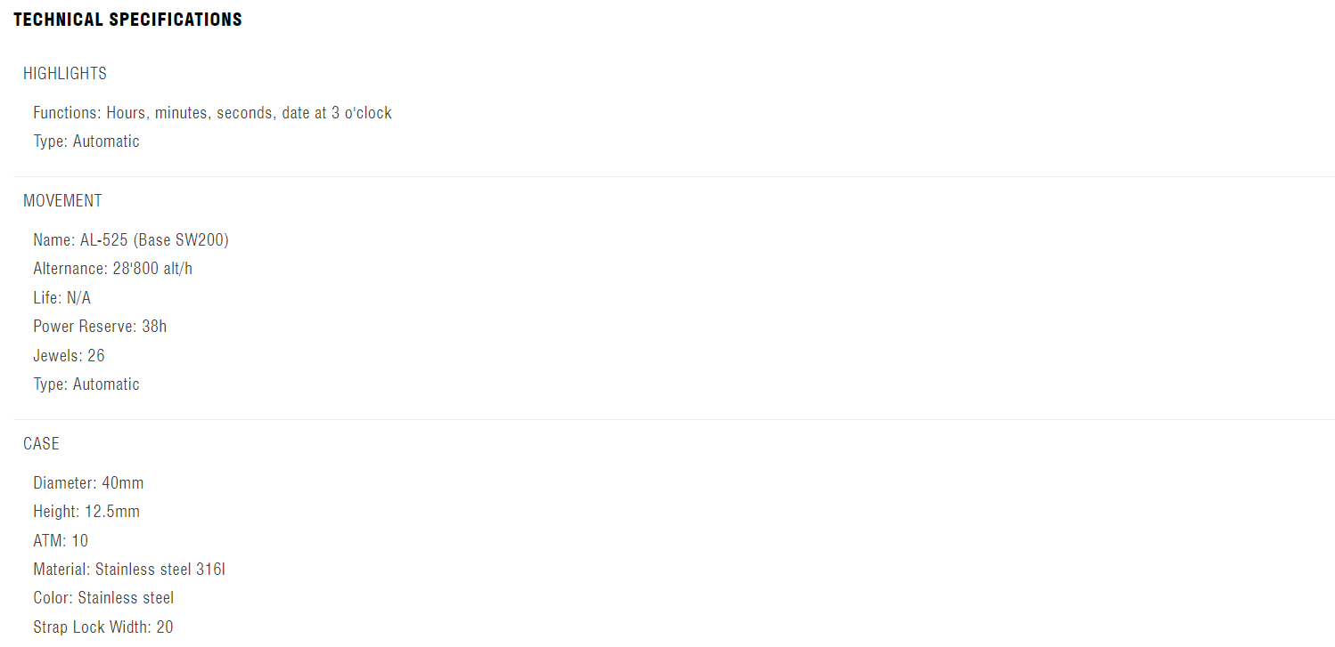 This Alpiner 4 Automatic comes in a 40mm case with a stainless steel bracelet. The automatic movement boasts a 38h power reserve. The watch offers hours, minutes, seconds, date at 3 o'clock features.