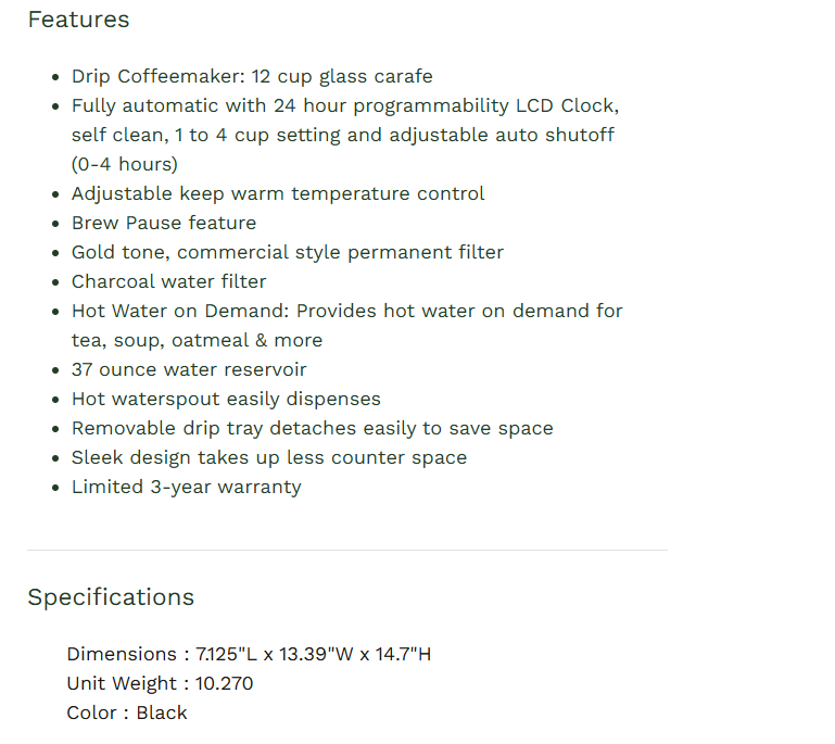 Coffee Plus 12 Cup Coffee Maker & Hot Water System