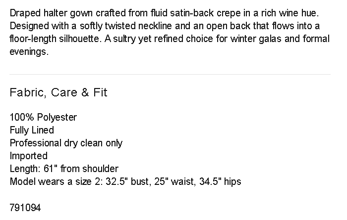 Draped halter gown crafted from fluid satin-back crepe in a rich wine hue. Designed with a softly twisted neckline and an open back that flows into a floor-length silhouette. A sultry yet refined choice for winter galas and formal evenings.