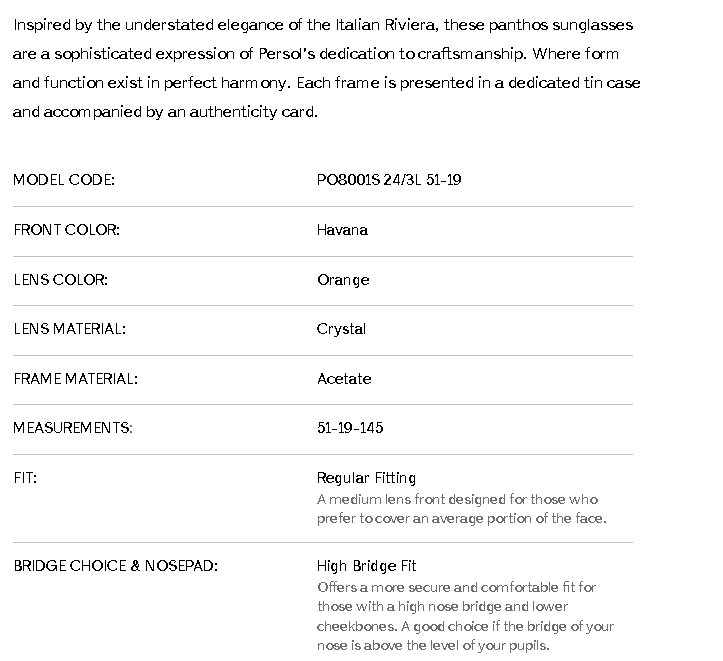 Inspired by the understated elegance of the Italian Riviera, these panthos sunglasses are a sophisticated expression of Persol's dedication to craftsmanship. Where form and function exist in perfect harmony. Each frame is presented in a dedicated tin case and accompanied by an authenticity card.