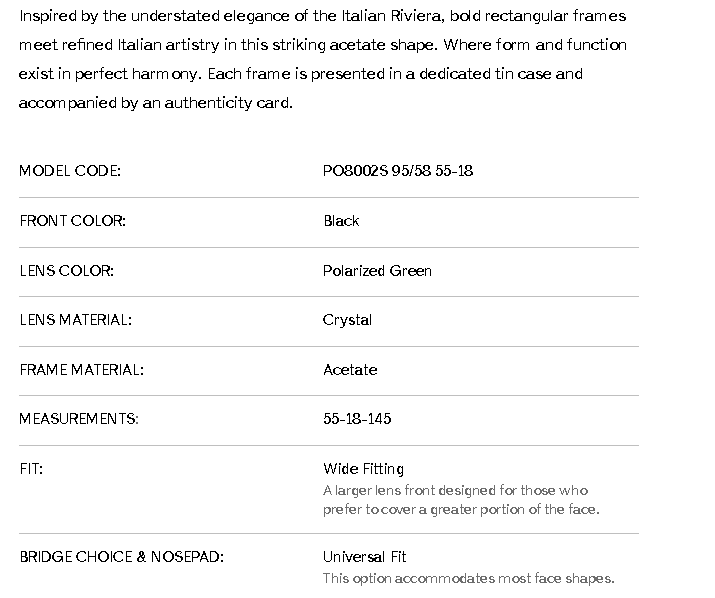 Inspired by the understated elegance of the Italian Riviera, bold rectangular frames meet refined Italian artistry in this striking acetate shape. Where form and function exist in perfect harmony. Each frame is presented in a dedicated tin case and accompanied by an authenticity card.