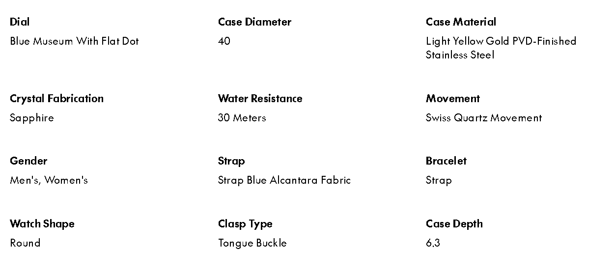 Featuring a gold PVD 40mm case with a dark blue, crushed-velvet patterned dial and Alcantara strap. Exclusively at movado.