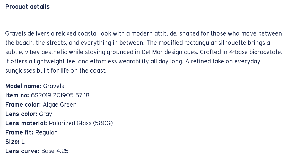 Gravels delivers a relaxed coastal look with a modern attitude, shaped for those who move between the beach, the streets, and everything in between. The modified rectangular silhouette brings a subtle, vibey aesthetic while staying grounded in Del Mar design cues. Crafted in 4-base bio-acetate, it offers a lightweight feel and effortless wearability all day long. A refined take on everyday sunglasses built for life on the coast
