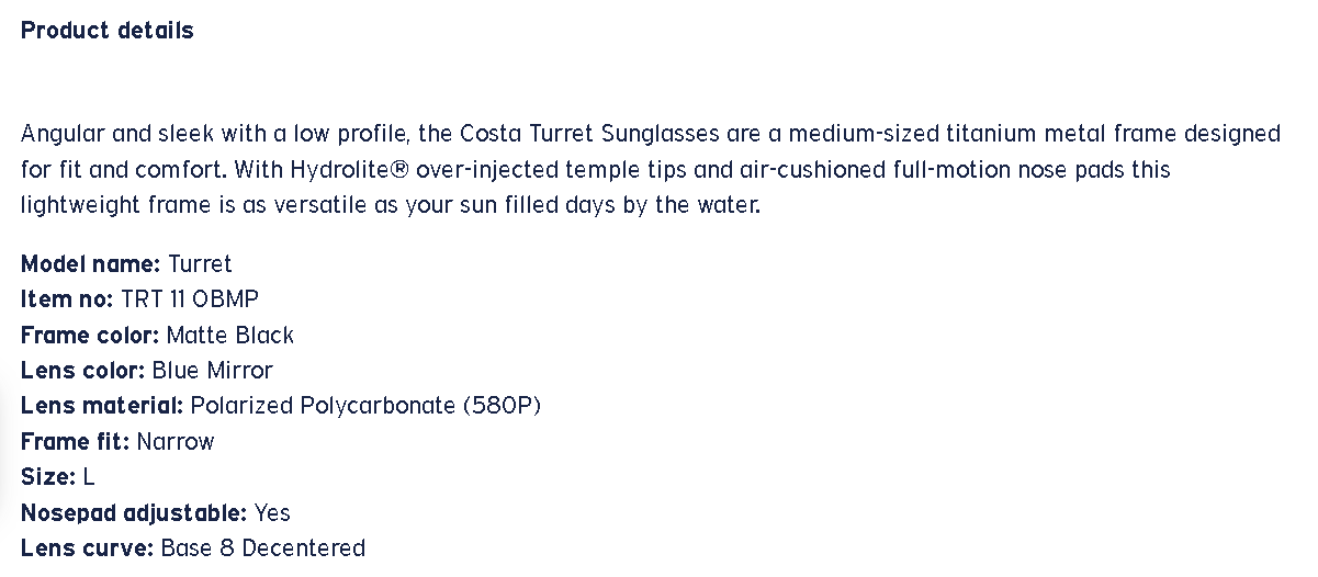 FIT: MEDIUM FRAME COLOR: MATTE BLACK LENS COLOR: BLUE MIRROR 580 POLYCARBONATE POLARIZED: YES