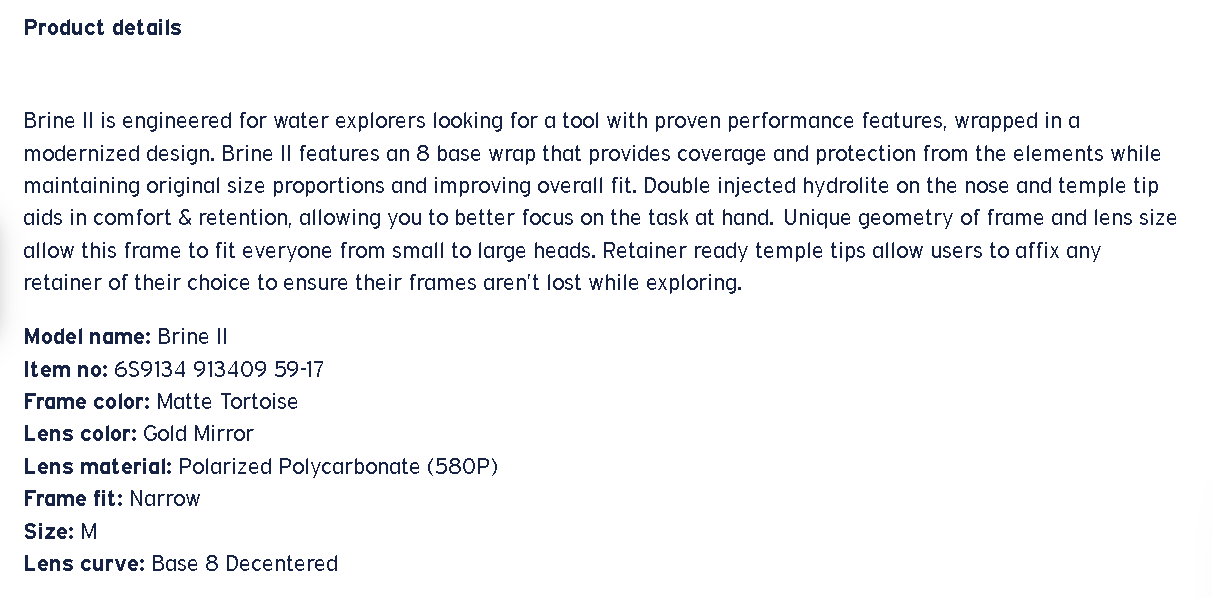 Brine II is engineered for water explorers looking for a tool with proven performance features, wrapped in a modernized design. Brine II features an 8 base wrap that provides coverage and protection from the elements while maintaining original size proportions and improving overall fit. Double injected hydrolite on the nose and temple tip aids in comfort & retention, allowing you to better focus on the task at hand. Unique geometry of frame and lens size allow this frame to fit everyone from small to large heads. Retainer ready temple tips allow users to affix any retainer of their choice to ensure their frames aren’t lost while exploring.