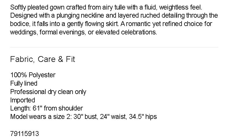 Softly pleated gown crafted from airy tulle with a fluid, weightless feel. Designed with a plunging neckline and layered ruched detailing through the bodice, it falls into a gently flowing skirt. A romantic yet refined choice for weddings, formal evenings, or elevated celebrations.