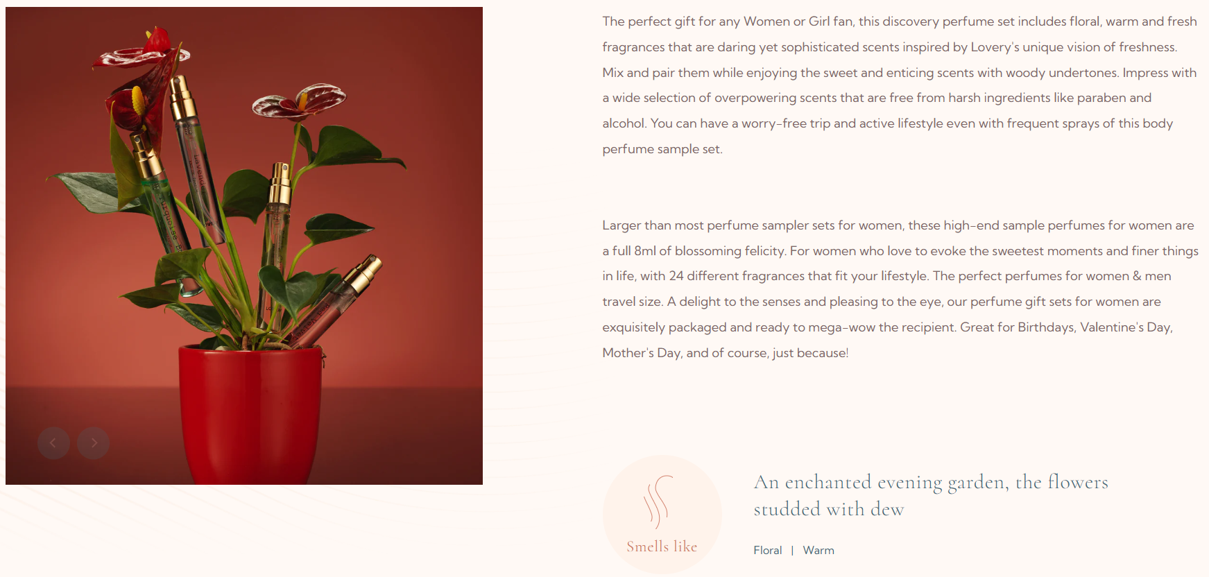 Immerse yourself in the refined scents of 24 long-lasting inspired fragrance blends of Lovery's perfumes. Sprayed solo or layered together, you can freely wear or combine scents to match your style