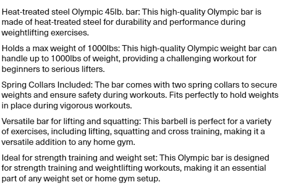 Lifeline Fitness Heat-Treated Steel Olympic Bar, 45lb Barbell With Two Spring Collars