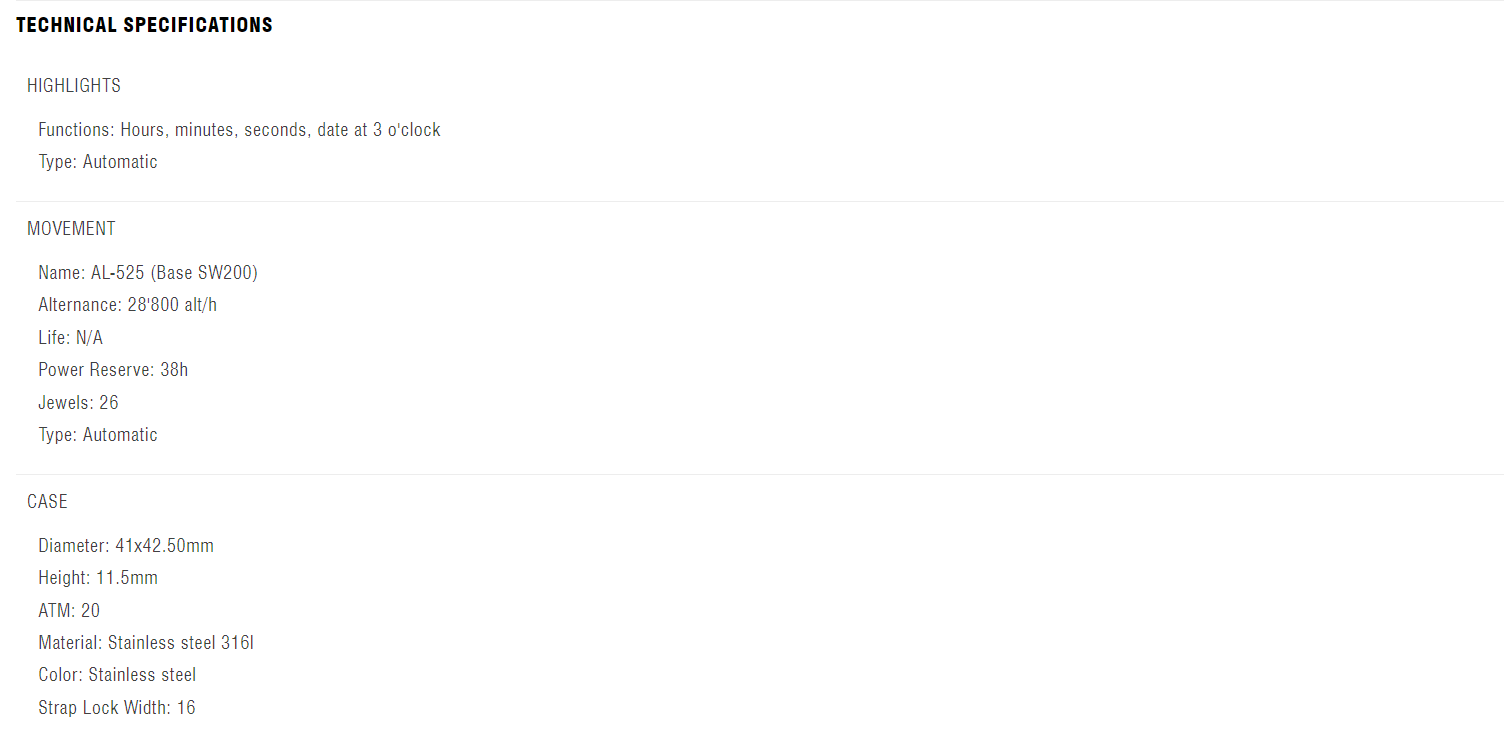 This Alpiner Extreme Automatic comes in a 41x42.50mm case with a rubber strap. The automatic movement boasts a 38h power reserve. The watch offers hours, minutes, seconds, date at 3 o'clock features.