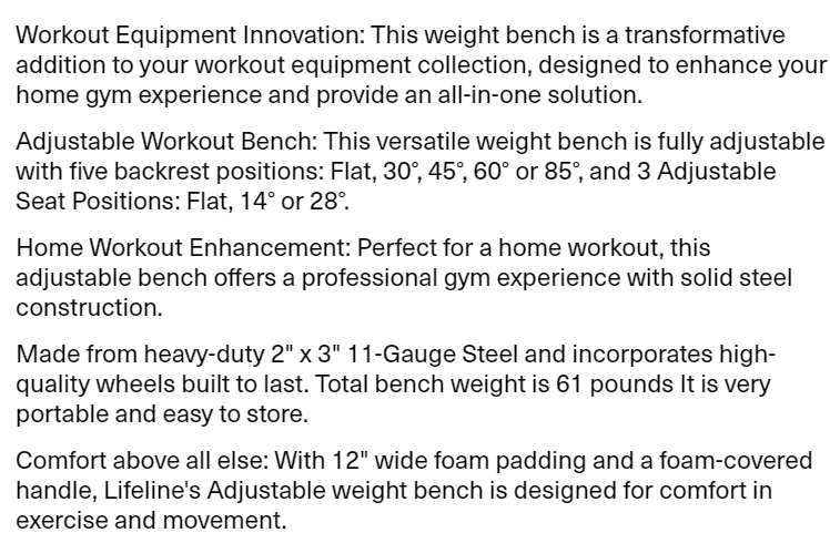 Lifeline Adjustable Weight Bench – For Weightlifting and Strength Training