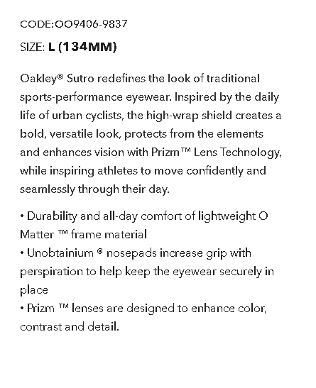 Oakley® Sutro redefines the look of traditional sports-performance eyewear. Inspired by the daily life of urban cyclists, the high-wrap shield creates a bold, versatile look, protects from the elements and enhances vision with Prizm™ Lens Technology, while inspiring athletes to move confidently and seamlessly through their day.
